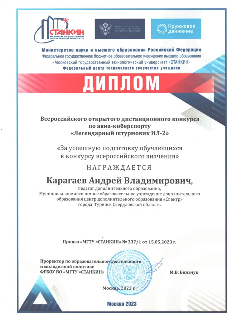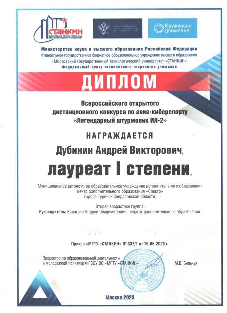 В апреле 2023 года обучающиеся объединения участвовали во Всероссийском открытом дистанционном конкурсе по авиа-киберспорту «Легендарный штурмовик Ил-2». Конкурс был организован Министерством науки и высшего образования Российской Федерации, исполнитель конкурса Федеральный центр технического творчества учащихся ФГБОУ ВО «Московский государственный технологический университет «Станкин». Конкурс был посвящен битве на Кавказе – одной из крупнейших оборонительно-наступательных операций Великой отечественной войны 1941-1945 гг. Цель конкурса: воспитание у подрастающего поколения гражданственности и патриотизма, расширение знаний обучающихся о битве на Кавказе, как одном из переломных сражений Великой отечественной войны посредством дистанционных технологий и киберспорта.