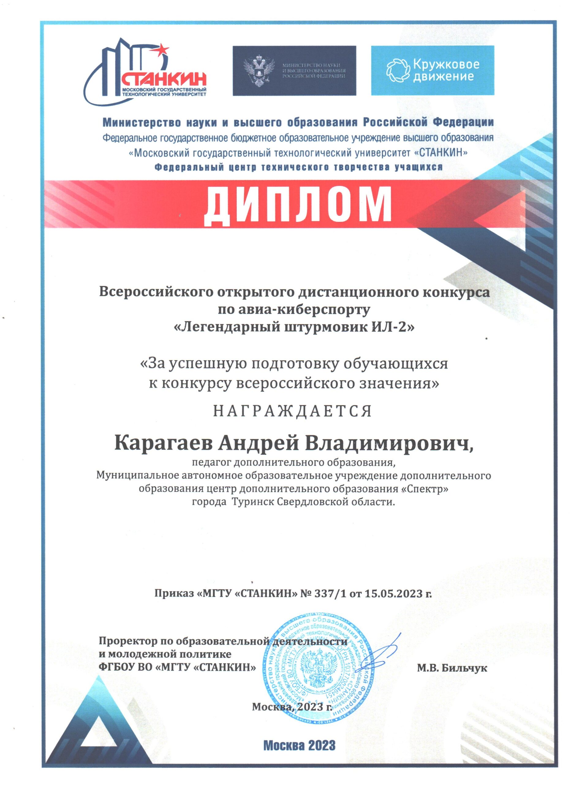 В мае были подведены итоги конкурса. И вновь победа, уже на более высоком Всероссийском уровне. Дубинин Андрей показал лучший результат в конкурсном полете и представленной творческой работе в виде презентации на тему «Битва на Кавказе». Андрей награжден дипломом I степени, а педагог Андрей Владимирович получил Диплом за успешную подготовку обучающихся к конкурсу всероссийского значения.