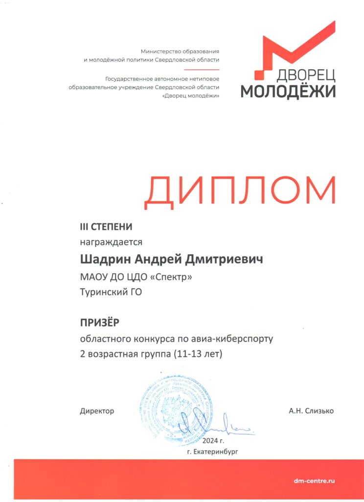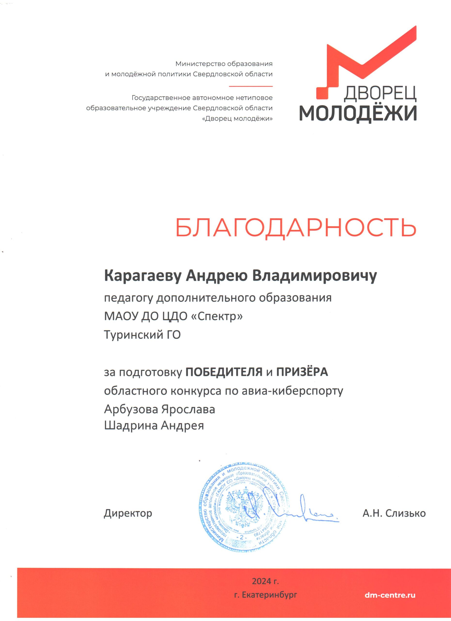 За подготовку победителя и призёра Областного конкурса по авиа-киберспорту Карагаев Андрей Владимирович, педагог дополнительного образования Центра дополнительного образования «Спектр» награжден Благодарственным письмом.